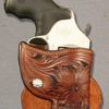 All of these holsters, with the exception of the J-frame, are steel lined–both the holster and the paddle–for strength, stability, and support of the weight of the firearm. Each style of holster has a trigger guard incorporated into the design. A tension screw retention device behind the silver concho allows you to adjust the draw of your pistol from the holster, whether you like it held tighter or more loosely. The paddle can be shaped to your body and is covered with either smooth or rough out leather, whichever you prefer. Each style of holster is available plain leather, basket stamped, or floral carved, and in most colors.